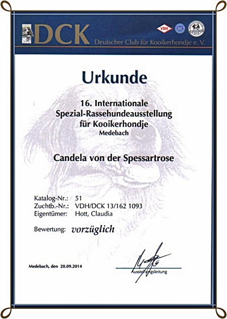 Für unsere Candela war es die erste Ausstellung und wir starteten in der starken Zwischenklasse. Candela hat aber alles souverän gemeistert. Sie erhielt die Bewertung " vorzüglich " und belegt einen hervorragenden 2. Platz / Res. Anwartschaft Deutscher Champion VDH