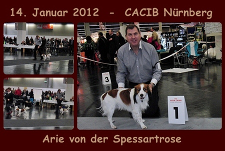 Arie von der Spessartrose hat am 14. Januar 2012 mit sehr großem Erfolg an der Internationalen Ausstellung in Nürnberg teilgenommen. Arie erhielt in der Offenen Klasse die Bestnote vorzüglich Platz 1 Anwartschaft Deutscher Champion VDH / CAC / CACIB und wird