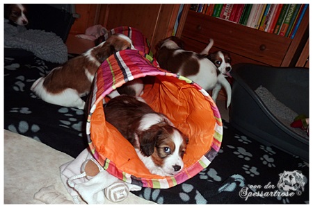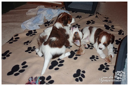 Unsere Welpen sind nun schon drei Wochen. Alle haben sich zu richtig süßen Wonneproppen entwickelt und die ersten Zähnchen brechen schon durch. Die Kleinen werden täglich aktiver, spielen immer öfter miteinander und erkunden auch schon Spielsachen.