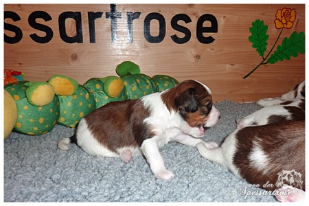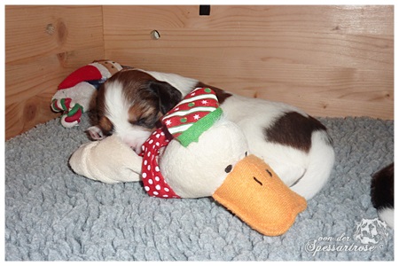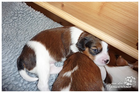 Alle Welpen entwickeln sich prächtig, sie haben die Augen geöffnet und machen ihre ersten noch sehr wackeligen Gehversuche. Kuscheln und schlafen steht aber immer noch an aller erster Stelle.