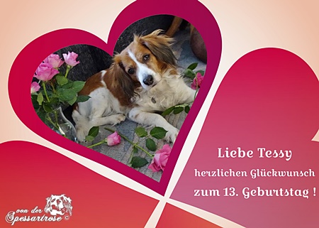 Meine liebe Tessy, ich wünsche Dir alles Liebe und Gutezu Deinem 14. Geburtstag !!! Du bist die Stammhündin meiner Zucht, mit Dir hat alles angefangen. Dank Dir gibt es inzwischen viele Spessartrosen !! Du bist nicht nur Mama, Oma, Uroma nein auch Ururoma bist Du bereits. Ich hoffe wir haben noch eine lange Zeit zusammen, ein Leben ohne Dich ist für mich unvorstellbar.