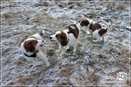 Am 20. Januar, haben wir uns mit vier Welpen aus unserem H - Wurf ( Heidi, Helena, Harry, Henry ) und ihren neuen Familien zur Welpenspielstunde im Haseltal von Bad Orb getroffen. Unsere Hedi Hummel war natürlich auch mit dabei, sowie Mama Candela, Oma Tessy und Tante Aennie. Die Hondjes haben sich alle prächtig verstanden und ausgiebig miteinander gespielt und getobt. Es war ein ganz toller Nachmittag bei herrlichem Wetter, an dem nicht nur die Hondjes sondern auch wir Menschen viel Spaß hatten.